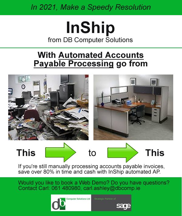 Do you want hassle-free Accounts Payable Invoice Processing? Do you want to minimise double-entry and avoid #overpayment to suppliers? Let #InShip from DB Computer Solutions Limerick, Cork, Dublin (SAGE partner) @DB_Comp do the work. Fully integrated with #Sage50, #Sage50c, #Sage200 and #Sage200c, InShip lets #businesses save time and money: