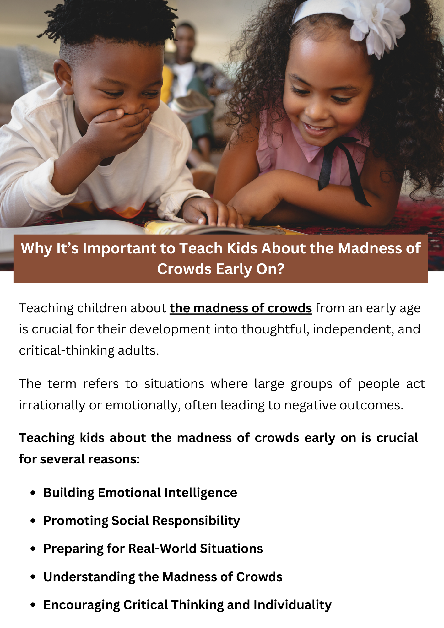 Teaching kids about the madness of crowds early on helps them recognize the dangers of blindly following popular trends and groupthink. Understanding this concept fosters critical thinking, encourages independent decision-making, and protects them from making impulsive choices driven by peer pressure. By learning to evaluate situations logically and resist the influence of the crowd, children develop resilience and the ability to make sound decisions throughout their lives. To know more visit here https://inflationeducation.net/product/the-madness-of-crowds/