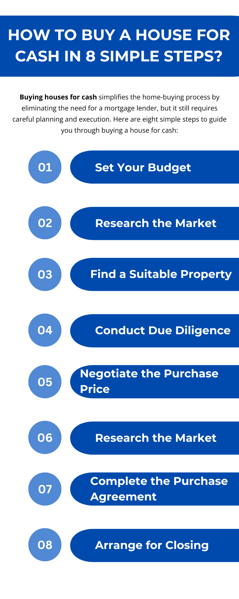 Buying a house for cash offers simplicity and flexibility in the home-buying process. By setting your budget, researching the market, finding a suitable property, conducting due diligence, negotiating the purchase price, completing the purchase agreement, arranging for closing, and closing the transaction—you can navigate the process efficiently and secure your new home with confidence. Each step ensures you make informed decisions and handle the transaction smoothly, setting the stage for a successful and stress-free home purchase. To know more visit here https://www.904homebuyer.com/buy