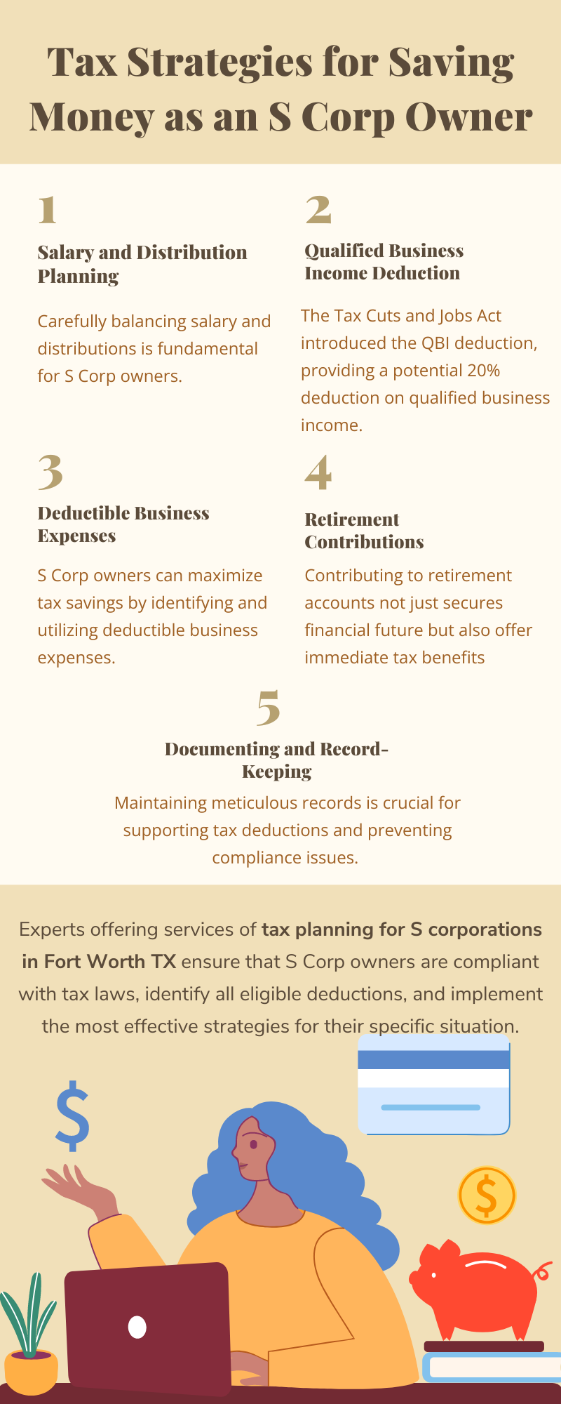 S Corp owners can maximize savings through a combination of salary and distribution planning, leveraging tax deductions, contributing to retirement accounts, and staying informed about credits and incentives. Professional guidance ensures that these strategies are implemented effectively, securing both short-term and long-term financial objectives. To know more visit here https://www.alignedwealthadv.com/tax-planning-fort-worth-tx