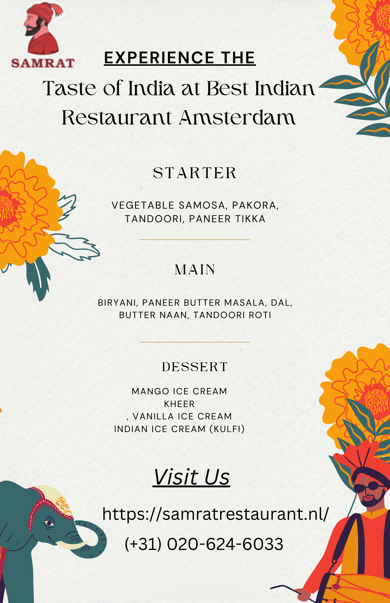 Looking for the best Indian restaurant in Amsterdam? Samrat Indian Restaurant offers an authentic dining experience with a wide selection of traditional Indian dishes, prepared with the finest spices and ingredients. Whether you’re craving rich curries or flavorful tandoori dishes, Samrat has it all. Visit us today and enjoy a memorable meal! For reservations, call us at (+31) 020-624-6033.