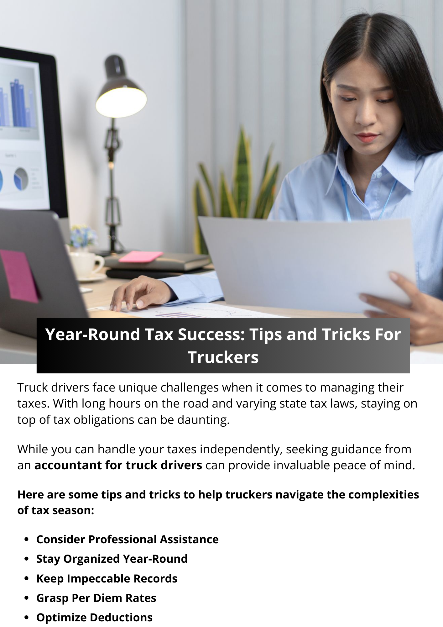 Achieving tax efficiency as a trucker demands diligence, organization, and knowledge. By maintaining meticulous records, optimizing deductions, and staying informed about tax law changes, you can navigate the tax landscape with confidence. With these essential strategies in your toolkit, you'll be well-equipped to minimize your tax burden and maximize your savings year-round. To know more visit here https://www.truckersprocpa.ca/trucking-accounting-services