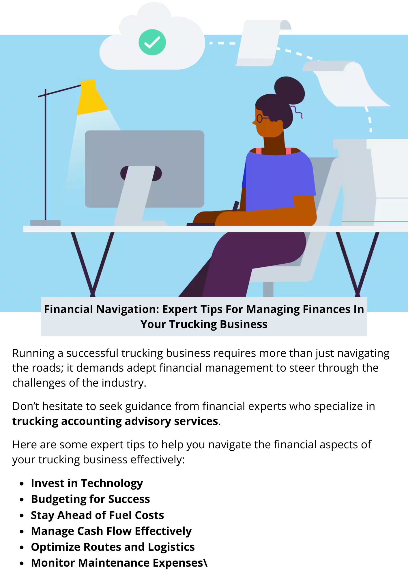 Mastering financial navigation is essential for the success and sustainability of your trucking business. By implementing expert tips and adopting a proactive approach to financial management, you can steer your business toward profitability and long-term success in the competitive trucking industry. To know more visit here https://www.truckersprocpa.ca/trucking-business-advisory-services