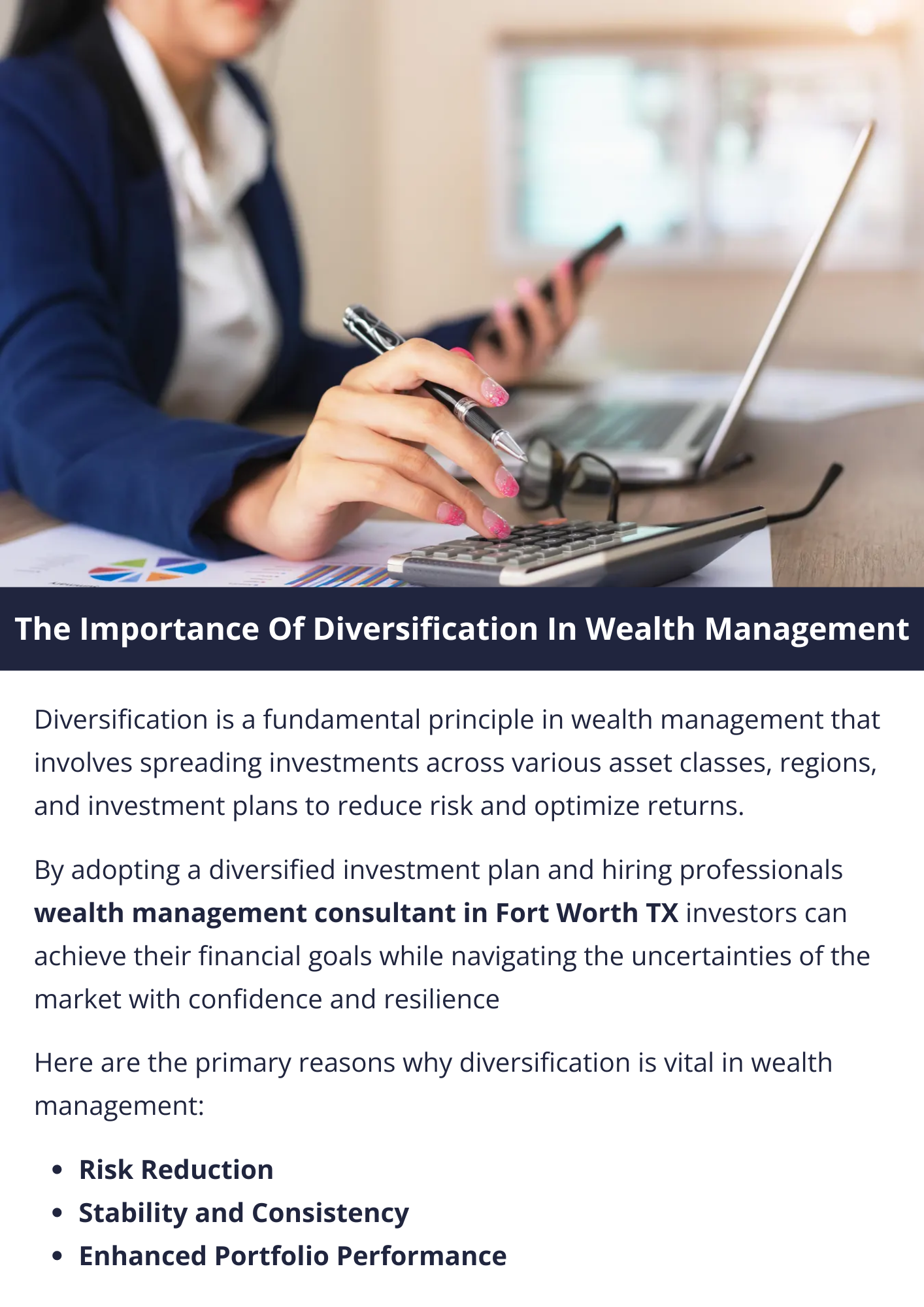 Diversification in wealth management is vital for reducing risk by spreading investments across various asset classes, industries, and regions. It promotes stability, enhances portfolio performance, preserves capital, captures opportunities, and ensures long-term wealth preservation. By maintaining a diversified portfolio, investors can achieve their financial goals while minimizing exposure to market fluctuations and unforeseen events. To know more visit here https://www.alignedwealthadv.com/