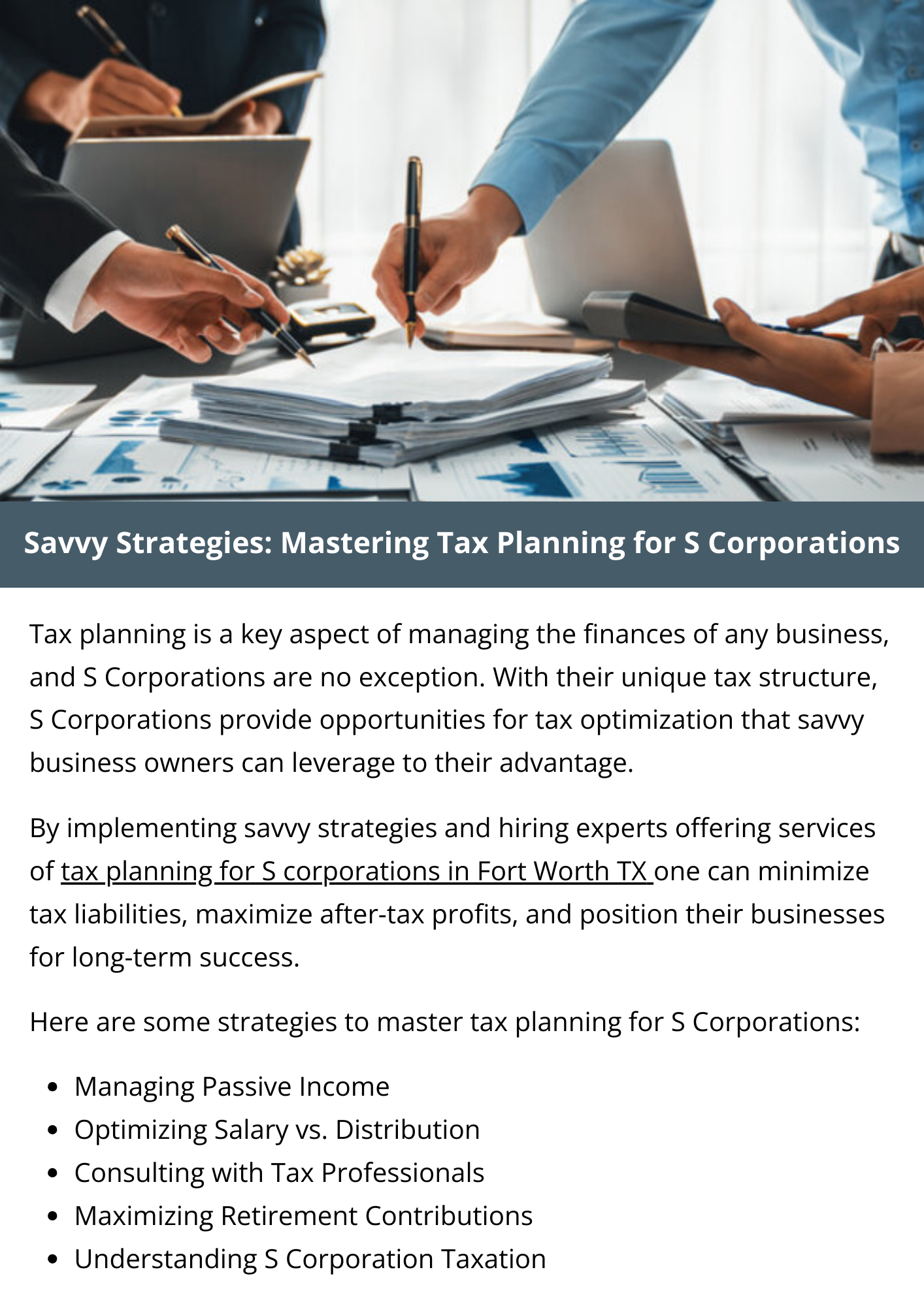 Mastering tax planning for S Corporations requires a comprehensive understanding of tax laws, diligent analysis of financial data, and strategic decision-making. By implementing savvy strategies tailored to their specific circumstances, S Corporation owners can minimize tax liabilities, maximize after-tax profits, and position their businesses for long-term success. To know more visit here https://www.alignedwealthadv.com/tax-planning-fort-worth-tx