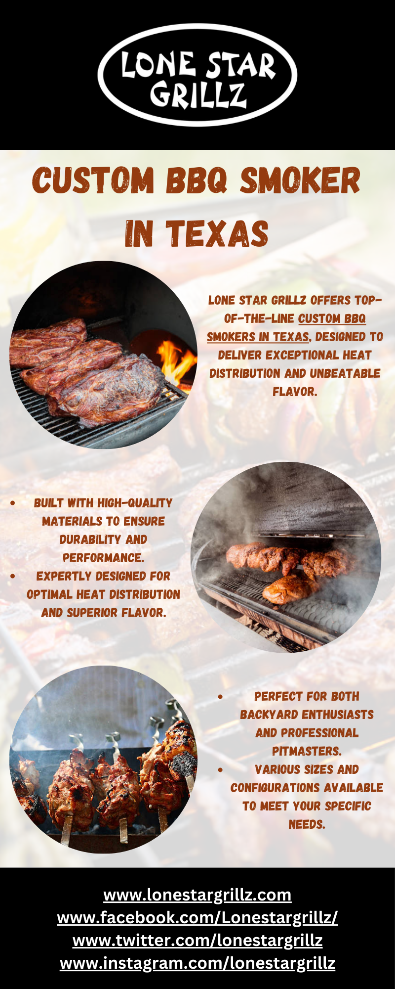 Discover the finest custom BBQ smokers in Texas with Lone Star Grillz. These expertly crafted smokers are designed for optimal heat distribution and rich flavor, perfect for both backyard enthusiasts and professional pitmasters. Made from high-quality materials, they offer exceptional durability and performance. Available in various sizes and configurations, each smoker ensures a top-notch barbecue experience, showcasing the best of Texas craftsmanship and quality. Learn more at https://lonestargrillz.com/collections/smokers