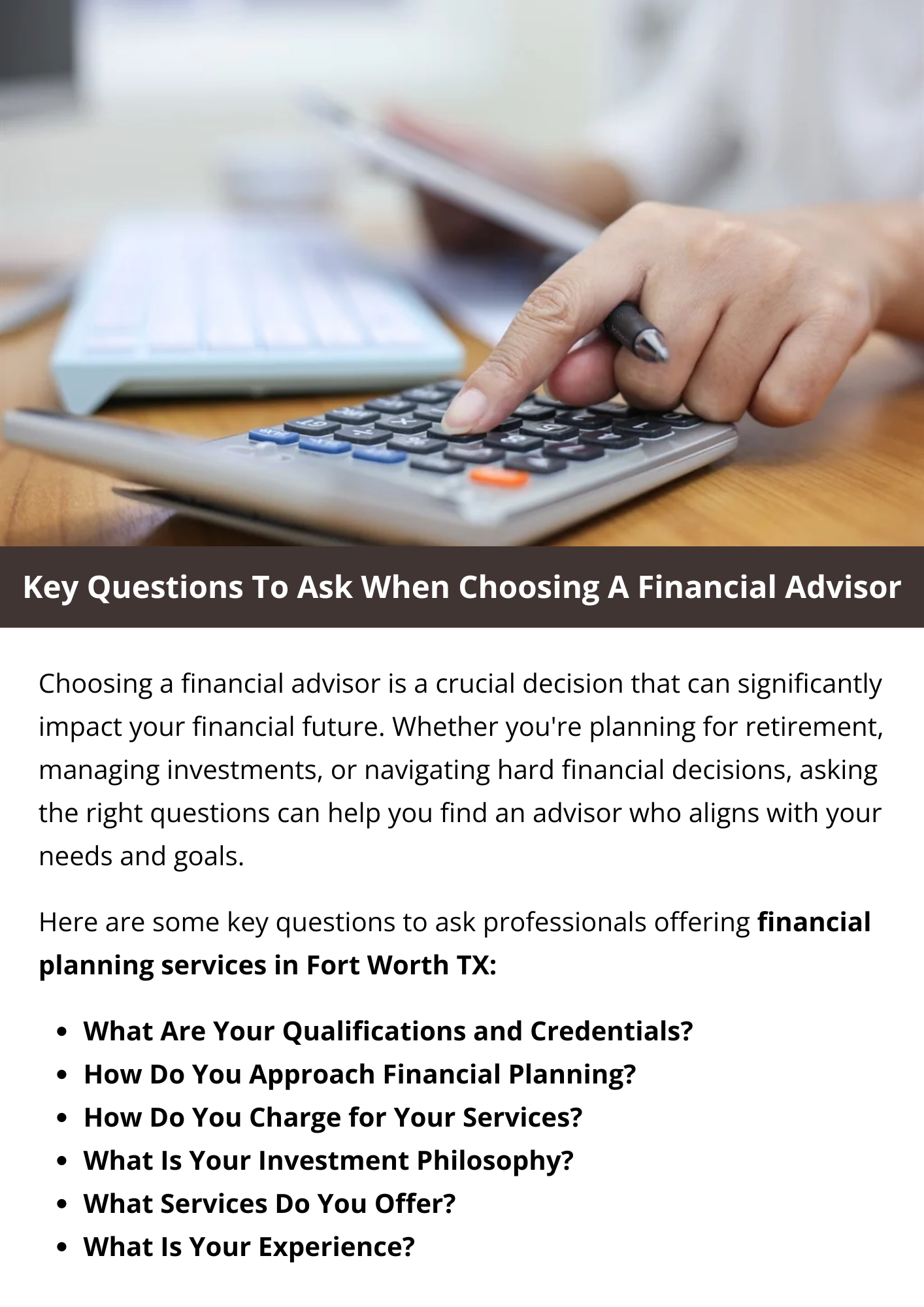 When choosing a financial advisor, ask about their qualifications, experience, and approach to investing. Inquire about fees, services offered, and how they tailor advice to your goals. Clarify their fiduciary status (obligation to act in your best interest) and how they communicate and update you on your investments. Lastly, seek references or reviews to gauge client satisfaction and trustworthiness. To know more visit here https://www.alignedwealthadv.com/financial-planning-fort-worth-tx