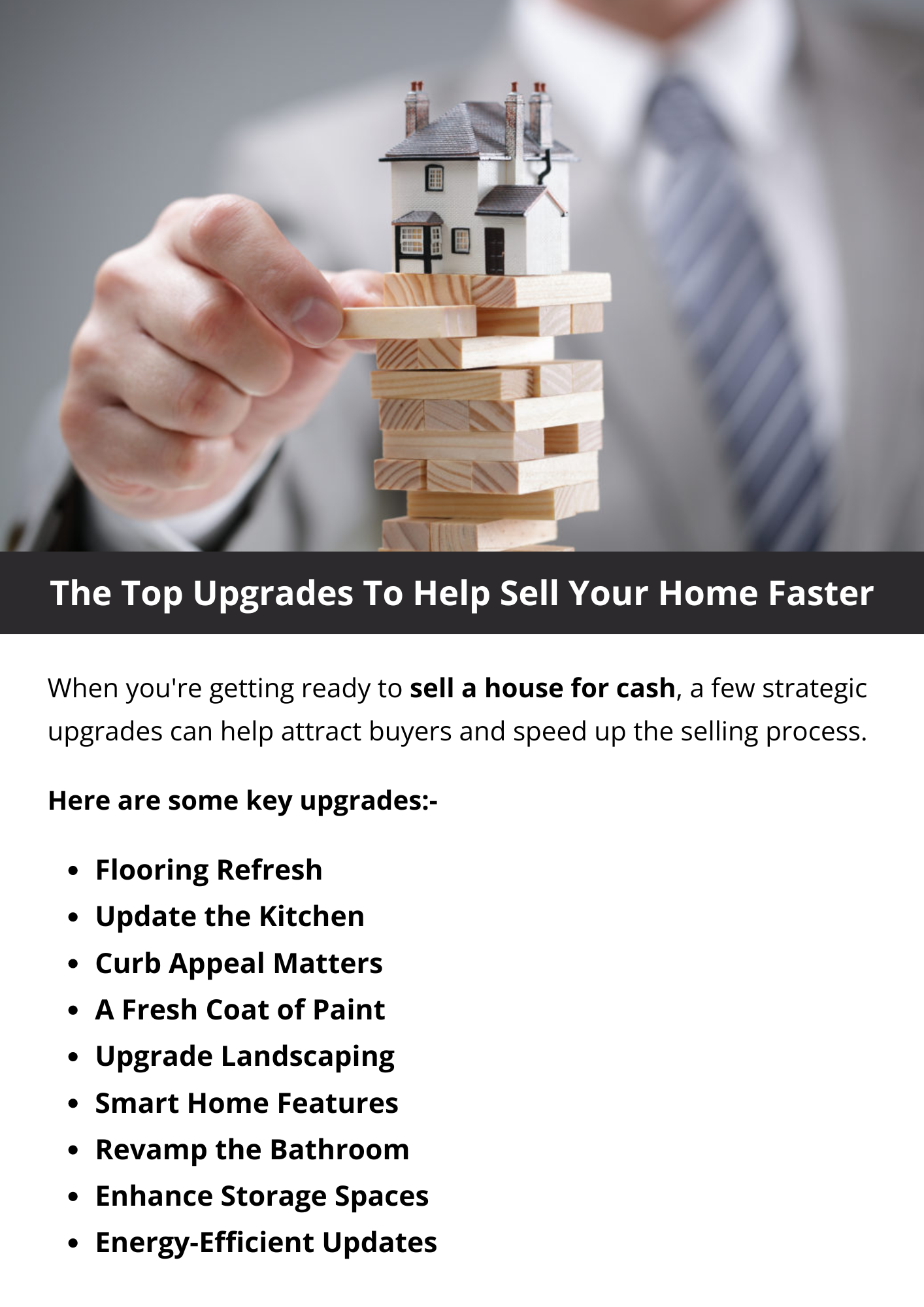When you're getting ready to sell your home, a few strategic upgrades can help attract buyers and speed up the selling process. Prioritize upgrades based on your budget and the condition of your home to make the most impact. By focusing on improvements that enhance appearance, functionality, and efficiency, you'll make your home more attractive to buyers and increase its market appeal. To know more visit here https://www.904homebuyer.com/sell
