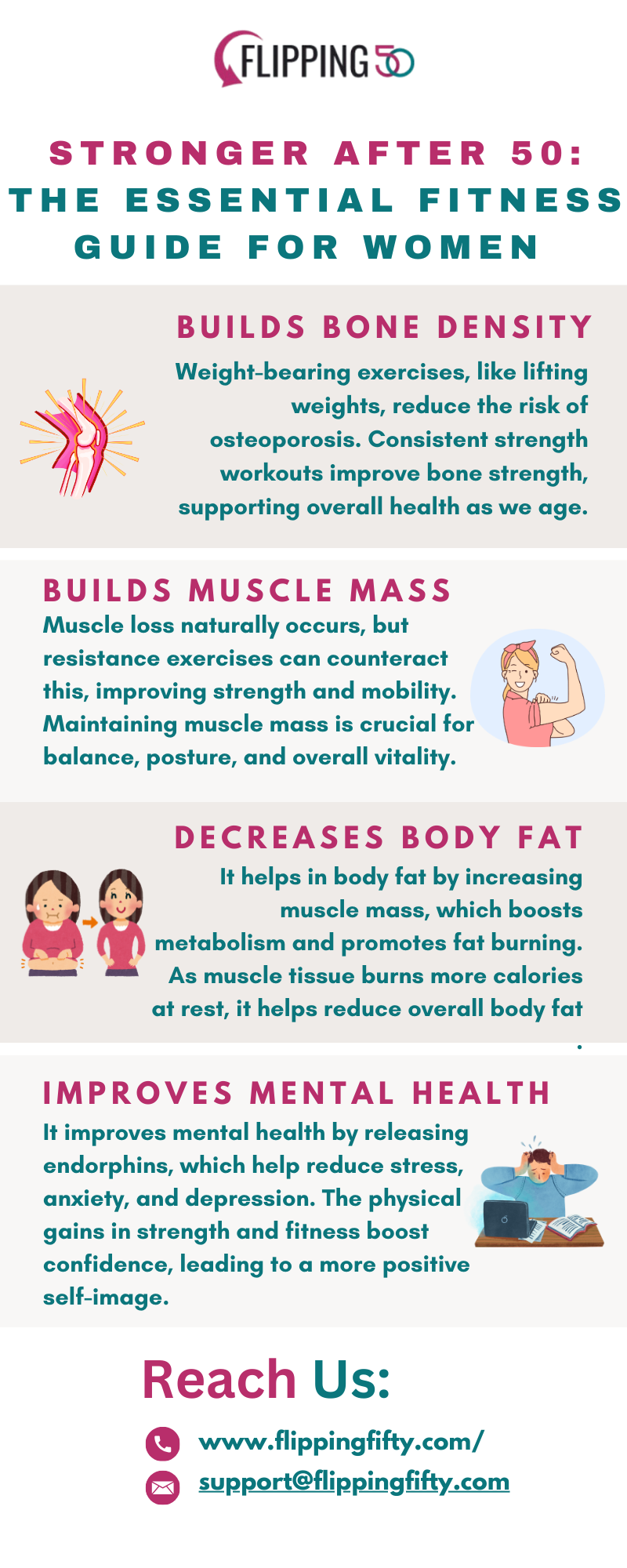 "Stronger After 50: The Essential Fitness Guide for Women" by Flipping 50 is your go-to resource for building muscle after 50, achieving lasting strength, vitality, and well-being. Specifically designed for women in this dynamic stage of life, this guide offers science-backed strategies for building muscle, improving mobility, and boosting energy. With a focus on age-appropriate fitness routines, nutrition tips, and mindset shifts, Flipping 50 empowers you to take charge of your health and feel your best at any age. Whether you're new to strength training or a seasoned fitness enthusiast, this guide will help you unlock your full potential and embrace a life of strength and confidence. To know more visit:https://www.flippingfifty.com/lose-100-lbs/
