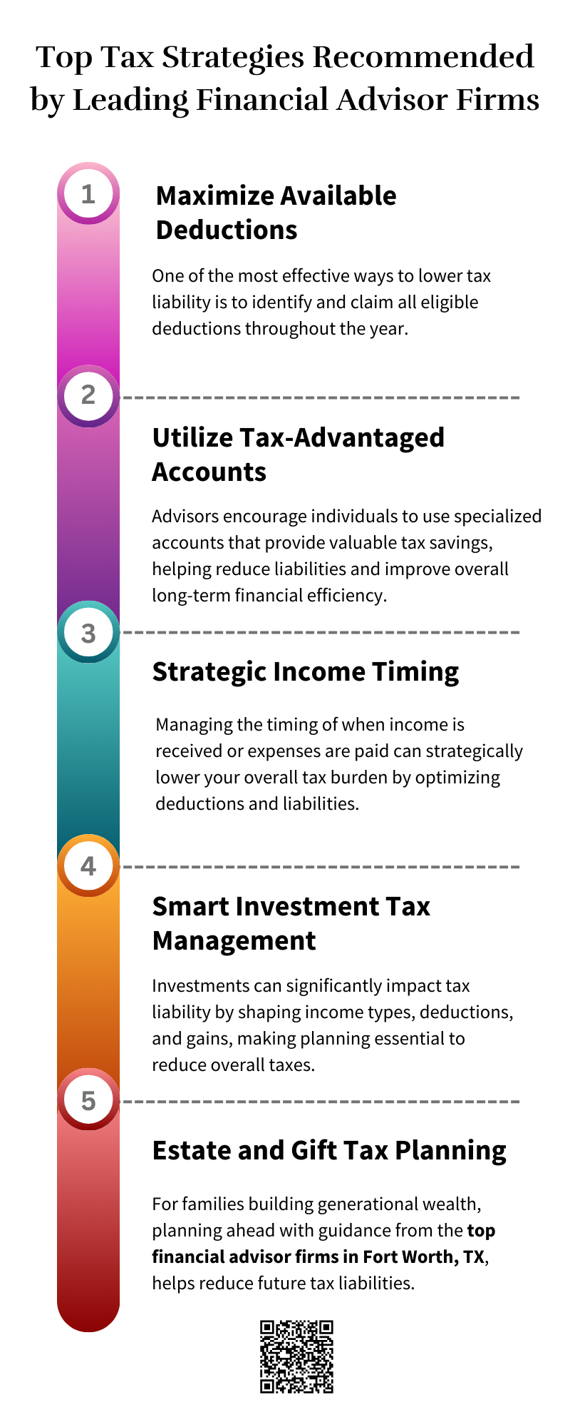 Top financial advisor firms in Fort Worth, TX, recommend smart tax strategies, such as maximizing retirement account contributions, tax-loss harvesting, and income splitting, where applicable. They also emphasize strategic charitable giving, timing capital gains wisely, using tax-efficient investments, and regularly reviewing tax plans to align with changing laws, income levels, and long-term financial goals. To know more visit here https://www.alignedwealthadv.com/financial-planning-fort-worth-tx