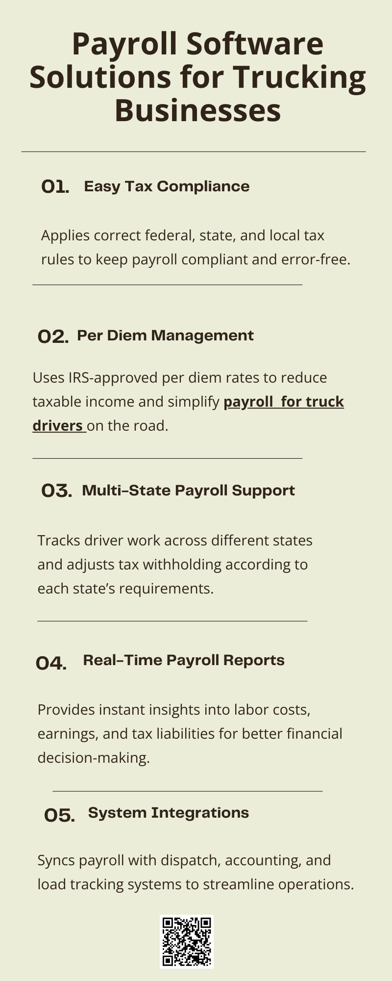 Payroll software solutions streamline payroll for truck drivers, handling complex calculations like mileage, overtime, and reimbursements efficiently. These systems ensure accurate, timely payments while maintaining compliance with tax laws and labor regulations. By automating payroll processes, trucking businesses save time, reduce errors, and gain detailed reporting, allowing management to focus on operations and driver satisfaction. To know more visit here https://www.truckersprocpa.ca/trucking-payroll-services