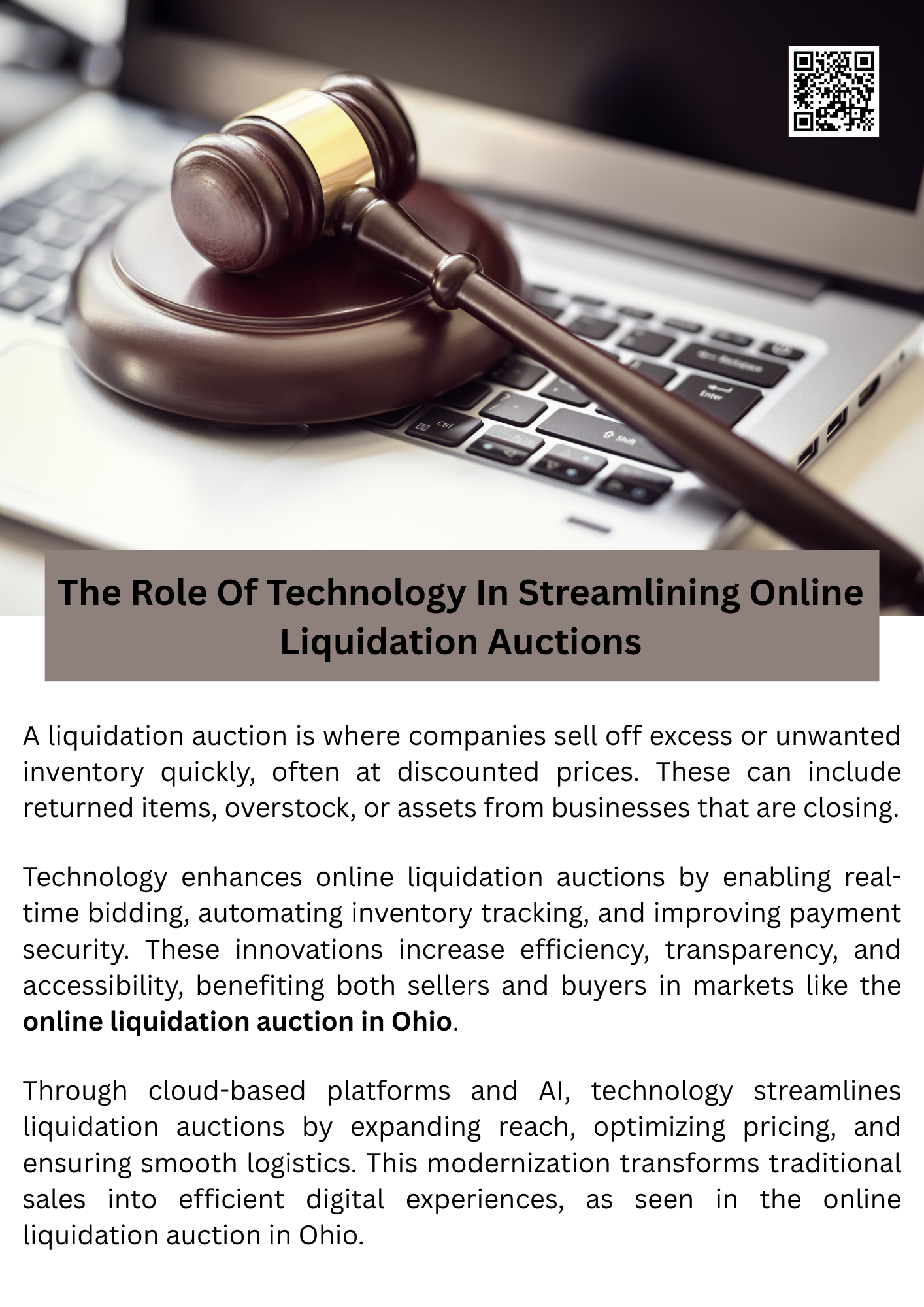 Technology plays a crucial role in streamlining online liquidation auctions in Ohio by automating bidding processes, improving inventory management, and enhancing buyer-seller communication. Advanced software and real-time data analytics help optimize auction timing and pricing, ensuring efficiency and transparency. Additionally, secure payment systems and mobile accessibility make participation easier for a broader audience, driving higher engagement and faster sales in the competitive online liquidation auction environment. To know more visit here https://www.wyethauctions.com/