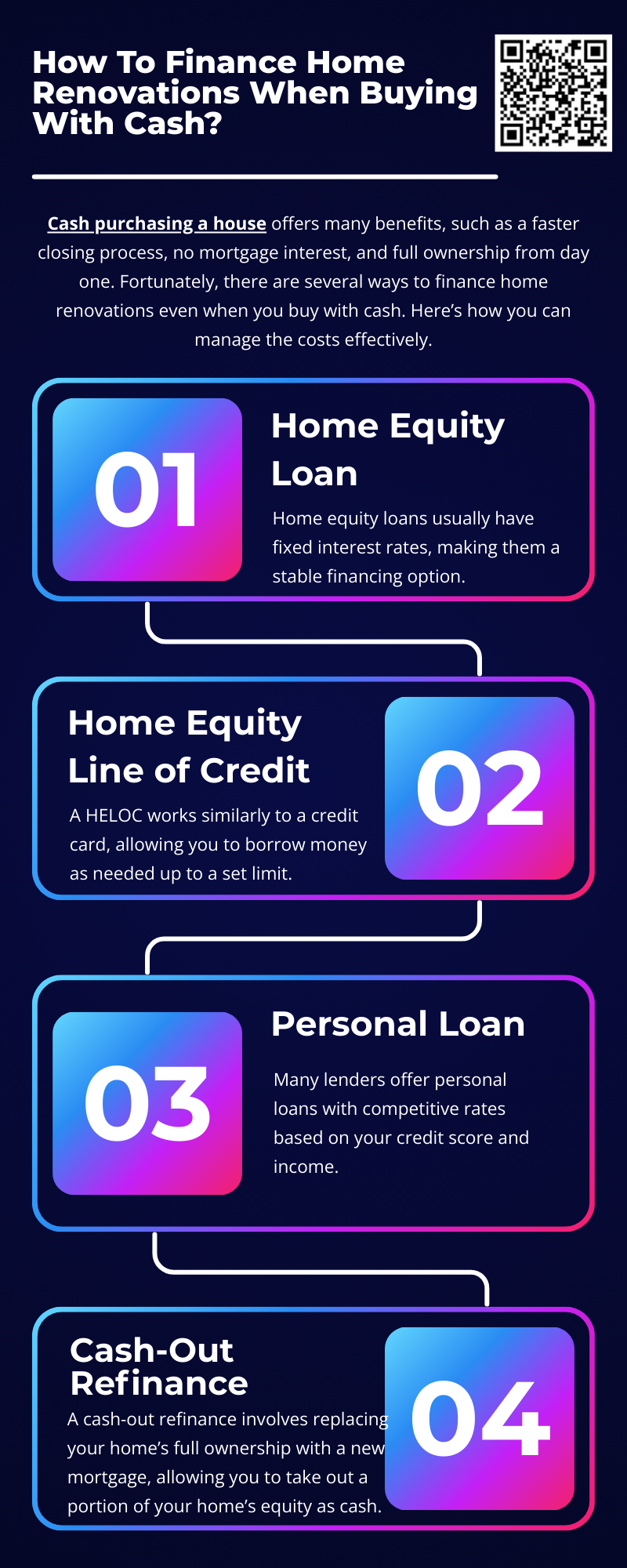 Even if you cash purchase a house, financing renovations is still possible through home equity options, personal loans, credit lines, or government programs. Choosing the right method depends on your financial situation, renovation needs, and long-term goals. With proper planning, you can upgrade your home while maintaining financial stability. To know more visit here https://www.904homebuyer.com/
