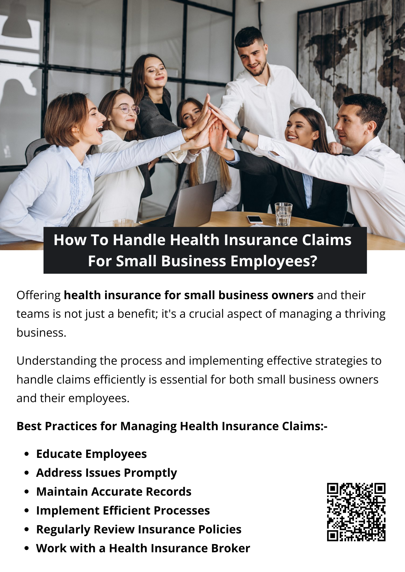 Offering health insurance for small business owners and their teams is not just a benefit; it's a crucial aspect of managing a thriving business. By educating employees, maintaining accurate records, working with a health insurance broker, implementing efficient processes, and supporting their employees' well-being. Proper management of health insurance claims not only helps in smooth operation but also strengthens the trust and satisfaction of your workforce. To know more visit here https://www.capbluecross.com/wps/portal/cap/employer/shop-group-plans