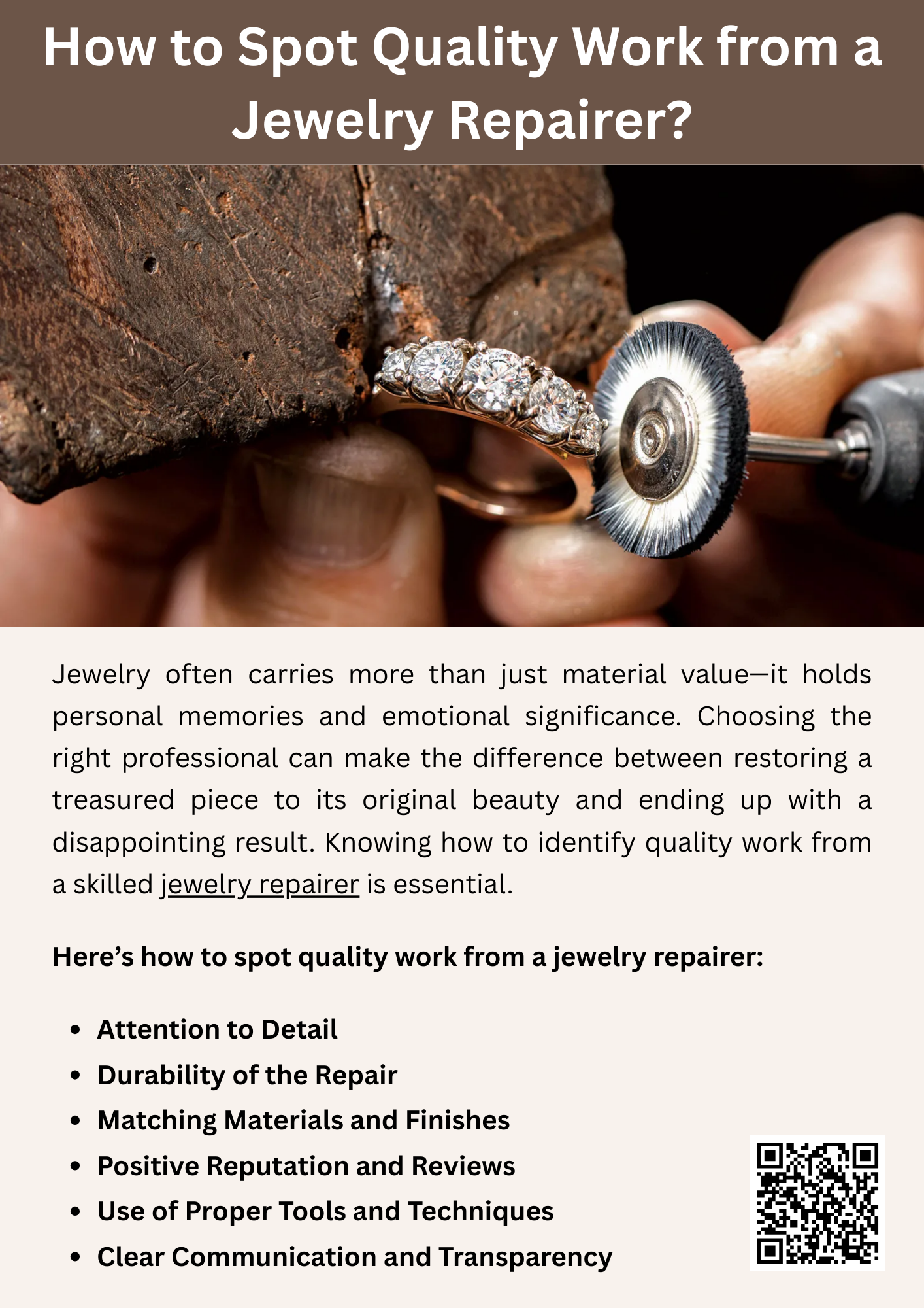 A skilled jewelry repairer ensures precision, attention to detail, and flawless craftsmanship. Quality work is seen in seamless soldering, secure stone settings, proper polishing, and maintaining the piece’s original design. Clear communication and transparency about repairs also reflect professionalism. Trustworthy jewelry repair combines expertise with care, ensuring your treasured pieces regain both beauty and durability. To know more visit here https://www.futerbrosjewelers.com/services/jewelry-repairs