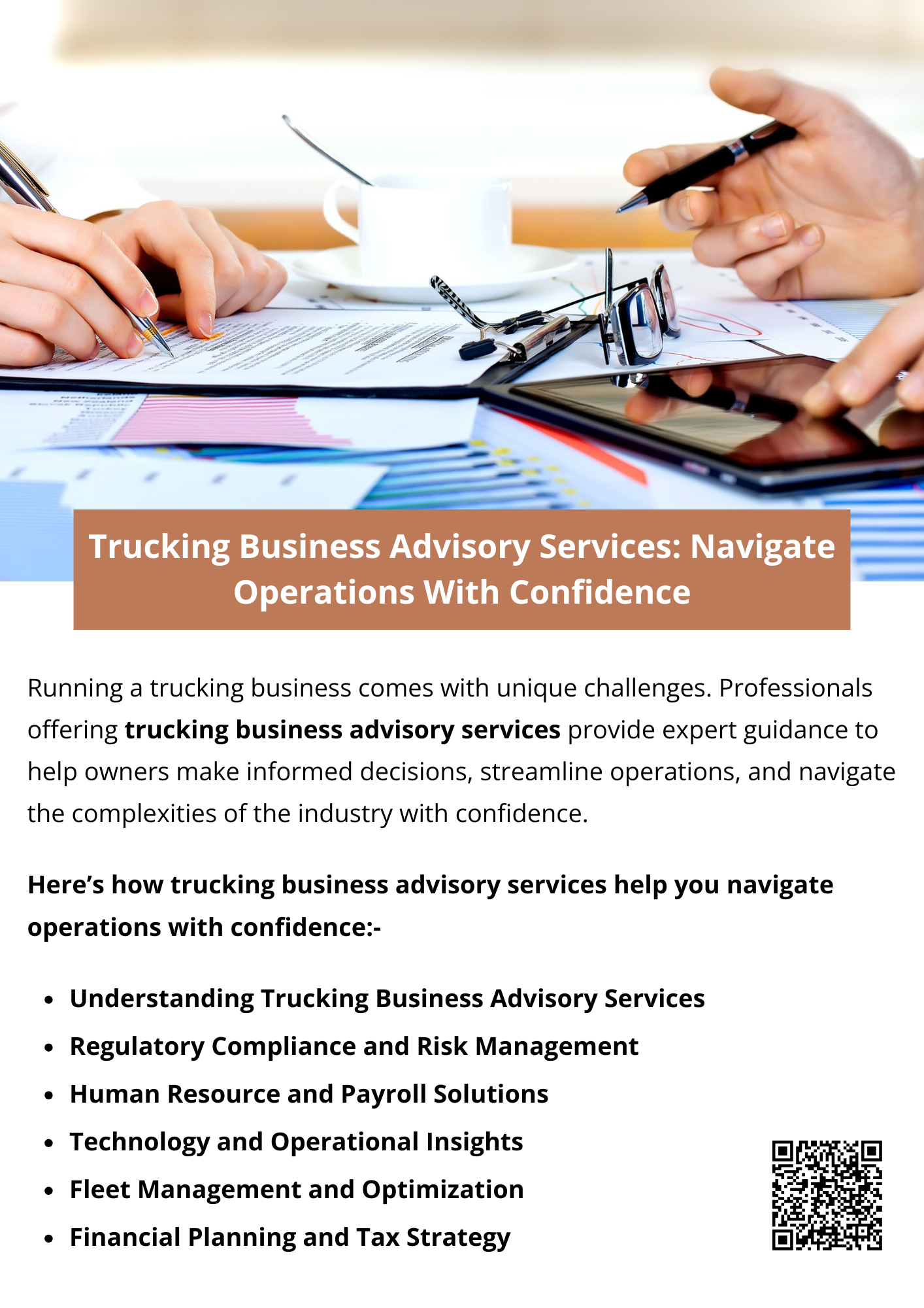 Experts offering trucking business advisory services empower owners to navigate operations with confidence. From fleet optimization and regulatory compliance to financial planning and human resources, these experts provide the guidance needed to run a successful, profitable trucking business. By leveraging advisory services, trucking companies can minimize risks, enhance efficiency, and focus on growth. To know more visit here https://www.truckersprocpa.ca/trucking-business-advisory-services