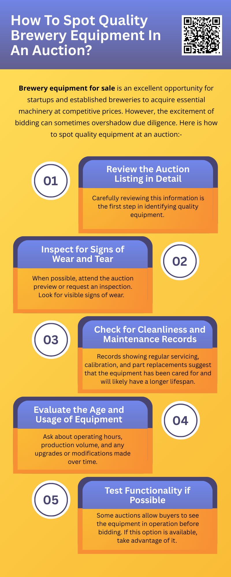 Spotting quality brewery equipment for sale requires careful inspection, research, and attention to detail. By evaluating maintenance history, physical condition, functionality, and manufacturer reputation, you can make confident decisions that save money without compromising performance. With the right approach, auctions become a reliable pathway to equipping your brewery with dependable, high-quality machinery. To know more visit here https://www.wyethauctions.com/industries/brewery-equipment