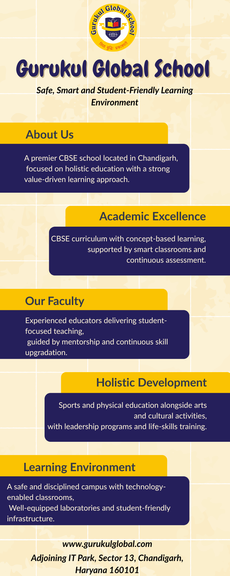 Gurukul Global School proudly stands among the best schools in Tricity Chandigarh. We offer a comprehensive CBSE curriculum supported by innovative teaching practices and dedicated educators. Our focus extends beyond textbooks to include sports, arts, life skills, and personality development. We strive to create a safe, nurturing, and engaging environment where every child can explore their potential. Our consistent academic performance and holistic approach make us a trusted educational institution in Chandigarh, Panchkula, and Mohali.