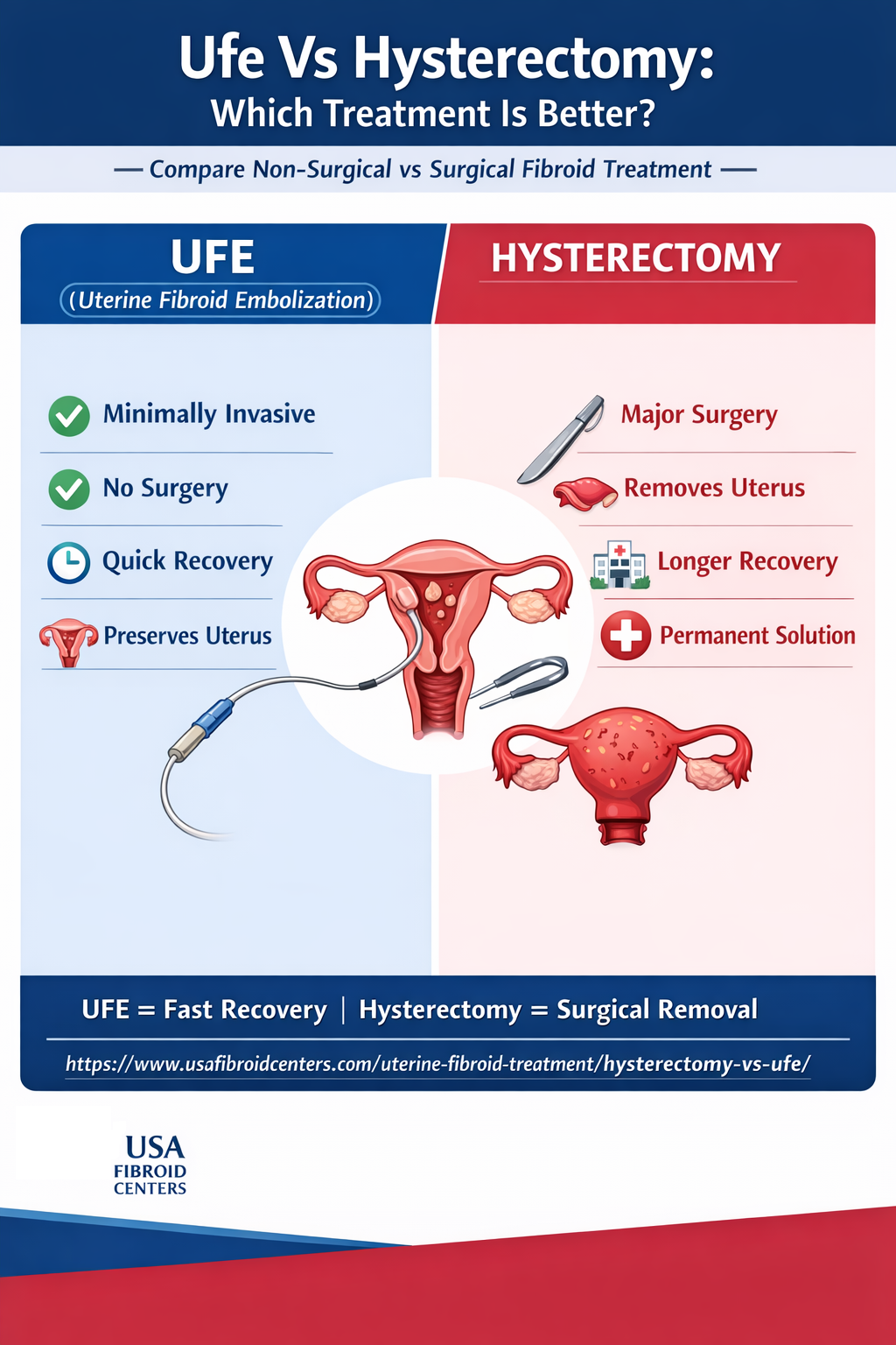 Ufe Vs Hysterectomy highlights the difference between two fibroid treatments. UFE is a minimally invasive procedure with quick recovery, while hysterectomy is a surgical option that removes the uterus and requires longer healing time. Explore the right treatment choice with USA Fibroid Centers. Read more : https://www.usafibroidcenters.com/uterine-fibroid-treatment/hysterectomy-vs-ufe/