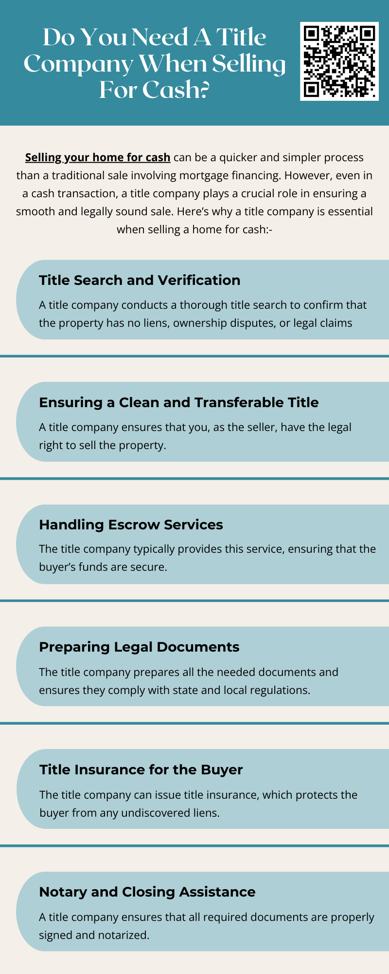 Even when you sell your home for cash, a title company can play a vital role in ensuring a smooth transaction. They handle title searches, verify ownership, and manage legal paperwork, helping to prevent future disputes. While not always required, using a title company adds security and peace of mind, especially when dealing with large sums of money in real estate. To know more visit here https://www.904homebuyer.com/sell