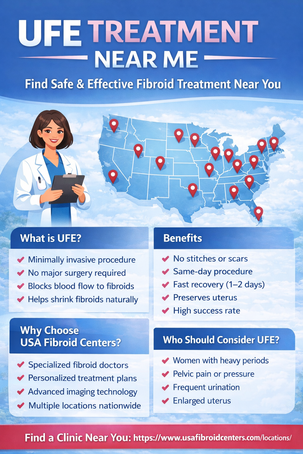 Searching for UFE Treatment Near Me? Uterine Fibroid Embolization (UFE) is a minimally invasive procedure that helps shrink fibroids without surgery. Get fast recovery, expert care, and personalized treatment options at trusted clinics. Visit https://www.usafibroidcenters.com/locations/ to find the best UFE Treatment Near Me today.