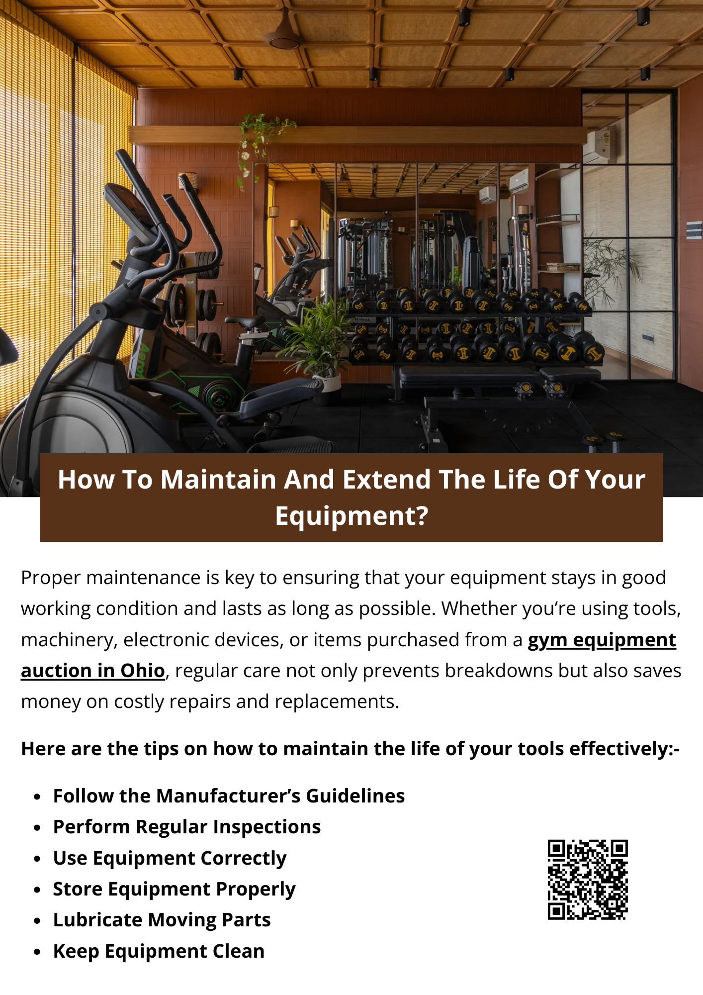 To maintain and extend your equipment’s life, clean it regularly, follow the manufacturer’s guidelines, and perform routine inspections. Lubricate moving parts and store equipment in a dry, safe place. Use equipment properly and replace worn parts promptly. If buying from a gym equipment auction in Ohio, extra care ensures long-lasting performance and prevents costly repairs. To know more visit here https://www.wyethauctions.com/industries/gym-fitness-equipment