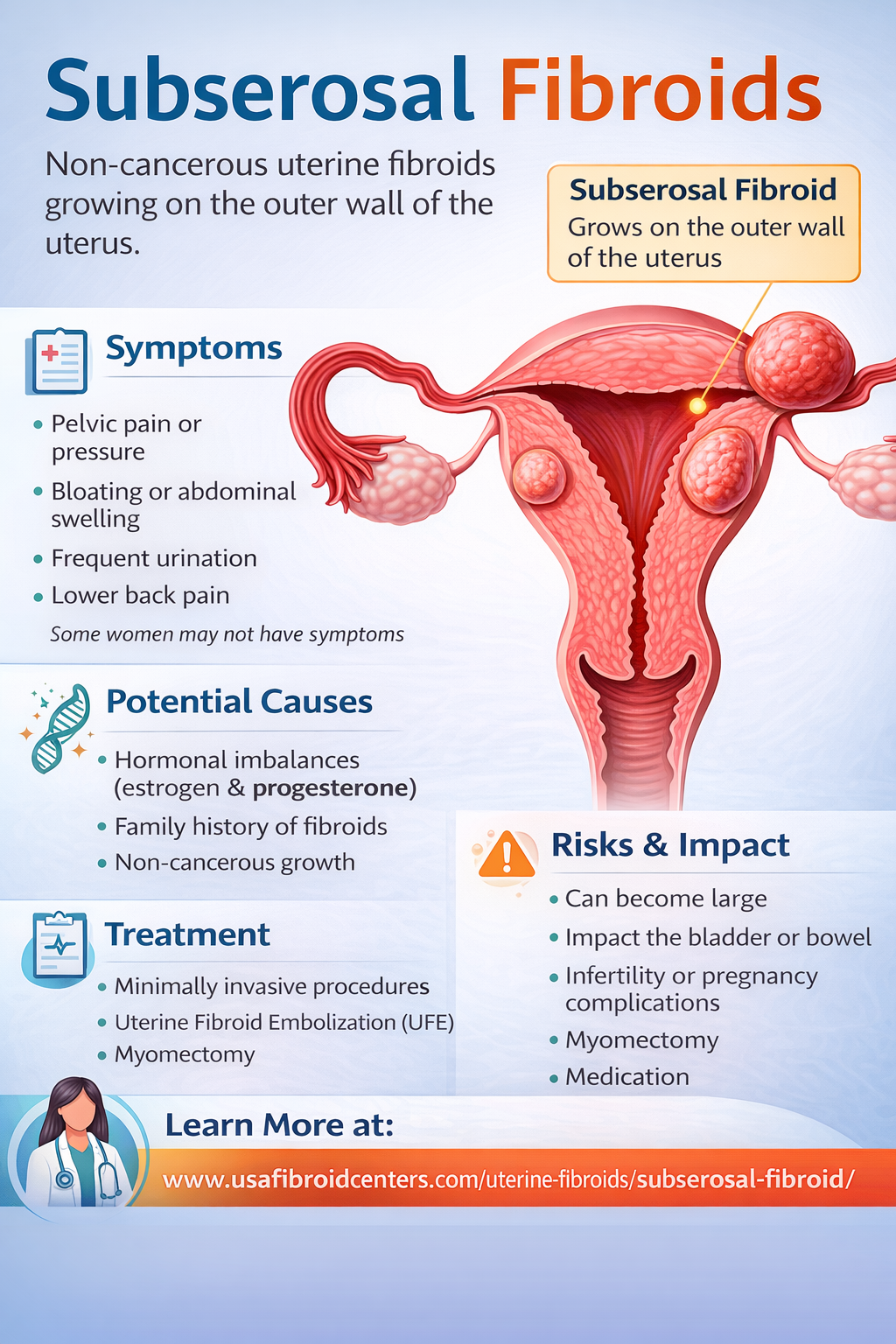 Learn about Subserosal Fibroids, noncancerous growths that develop on the outer wall of the uterus. Discover common symptoms such as pelvic pressure, bloating, frequent urination, and lower back pain, along with possible causes and risk factors. Explore diagnosis methods and minimally invasive treatment options available at USA Fibroid Centers to help relieve discomfort and improve quality of life. Read more : https://www.usafibroidcenters.com/uterine-fibroids/subserosal-fibroid/